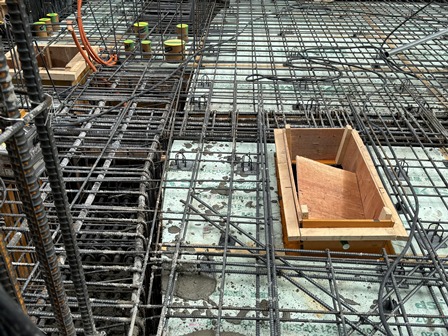 配筋し、型枠を建て込んだところにコンクリートを流し込んでいきます。
