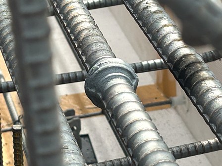 実はガス圧接継手という方法で鉄筋同士をつなげて長い鉄筋を造っています。