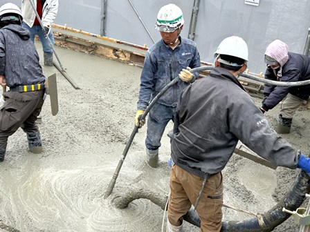 打設用ホースを操って生コンクリートを流し込む職人さんに、