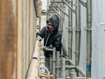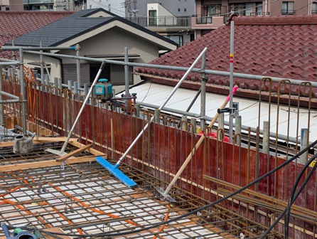 見てみると、職人さんが生コンが注がれている型枠の外側を
