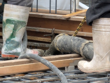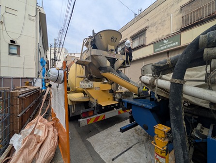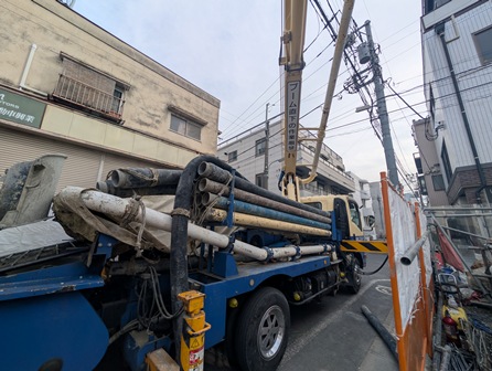 ポンプ車から出ている管の先で生コンが出されています。