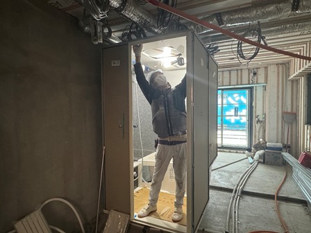 その後壁のパネルを設置し、銀色の部分のつなぎ目をシーリング材で埋めていきます。