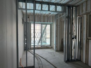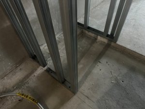 どのように工事が行われるかというと、まずはLGSを設置する場所に墨出しを行い、天井と床にランナーと呼ばれるコの字型のレールを設置します!床にこの字のレールが写真でも見えていますね!