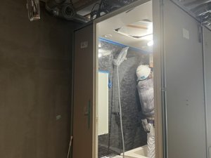 ユニットバスの奥に見えておりますが……部屋全体に銀色のものが設置されております。