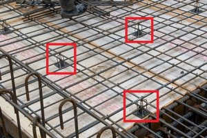 スラブ配筋の中に等間隔に並んでいるプラレールの橋(写真赤枠)みたいなものがあります。