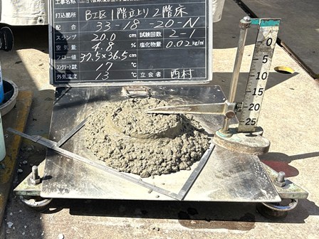 安心・安全な建物を造るため、打設前には生コンクリートの検査を実施します。