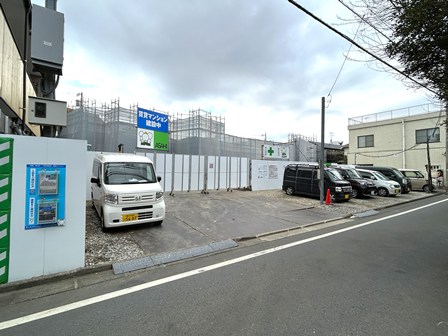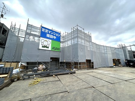 足場の養生シートには「賃貸マンション建設中」のシートと、