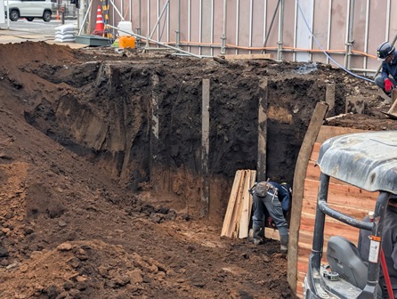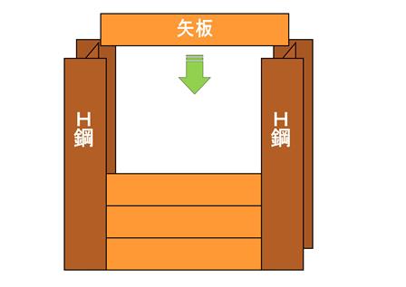 掘っていく過程で、H鋼とH鋼の間に矢板を差し込んでいきます。