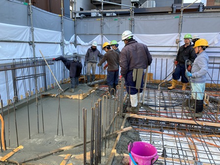 躯体工事が完了すると、いよいよコンクリートを打ち込みます。