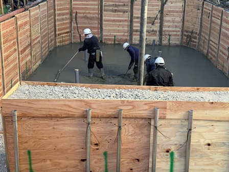 凸凹とした地面にコンクリートを流し込み、平らな地面を作っていきます。