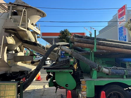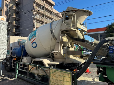 生コン車でどろどろとしたコンクリートが運ばれてきます。