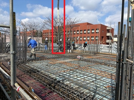最初の打設と同様に、ポンプ車の管(赤く印したもの)から生コンが出ています!